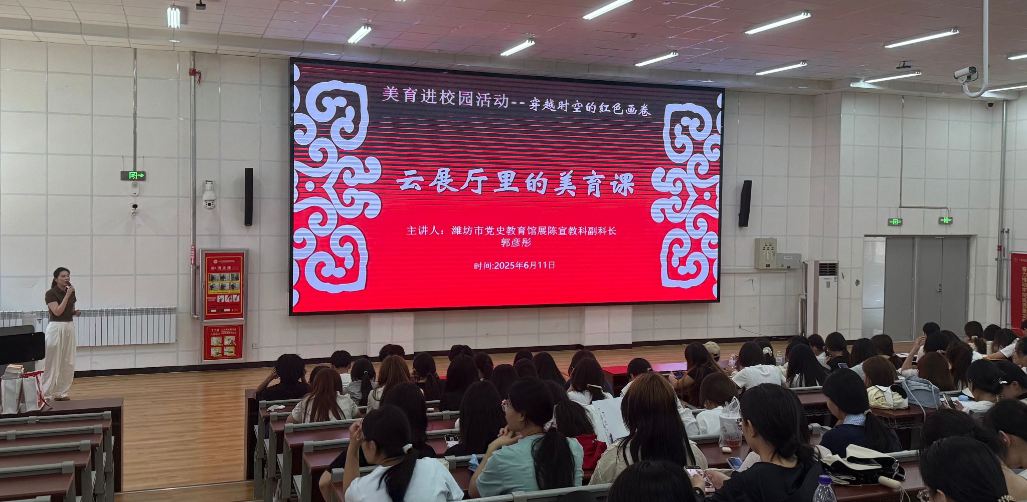 6月11日下午,学校迎来一堂别开生面的美育思政课。潍坊市党史教育馆展陈宣教科副科长郭彦彤以“穿越时空的红色画卷——云展厅里的美育课”为主题,通过数字化云展厅技术,带领师生沉浸式回顾潍坊地区波澜壮阔的党史历程,深情讲述了王尽美、庄龙甲等革命先烈的英雄事迹,让红色基因在新时代青年心中生根发芽。
